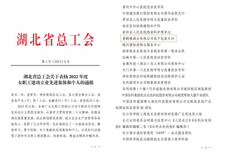 近日,湖北總工會(huì)表彰一批2022年度女職工建功立業(yè)先進(jìn)集體和個(gè)人,黃鶴樓酒業(yè)咸寧包裝車間喜獲“湖北省女職工建功立業(yè)標(biāo)兵崗”榮譽(yù)稱號(hào)。